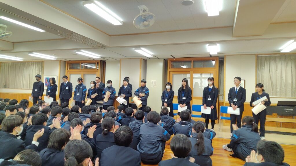 はじめに賞状伝達が行われました。科学、英語、作文、統計グラフ、書道、絵画など様々な分野で清陵生の活躍が見られました。