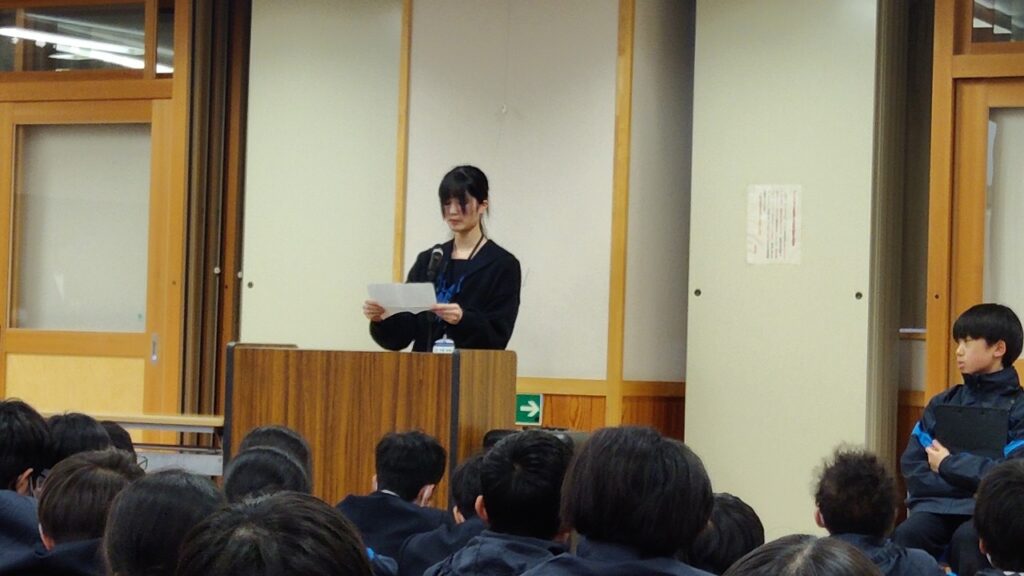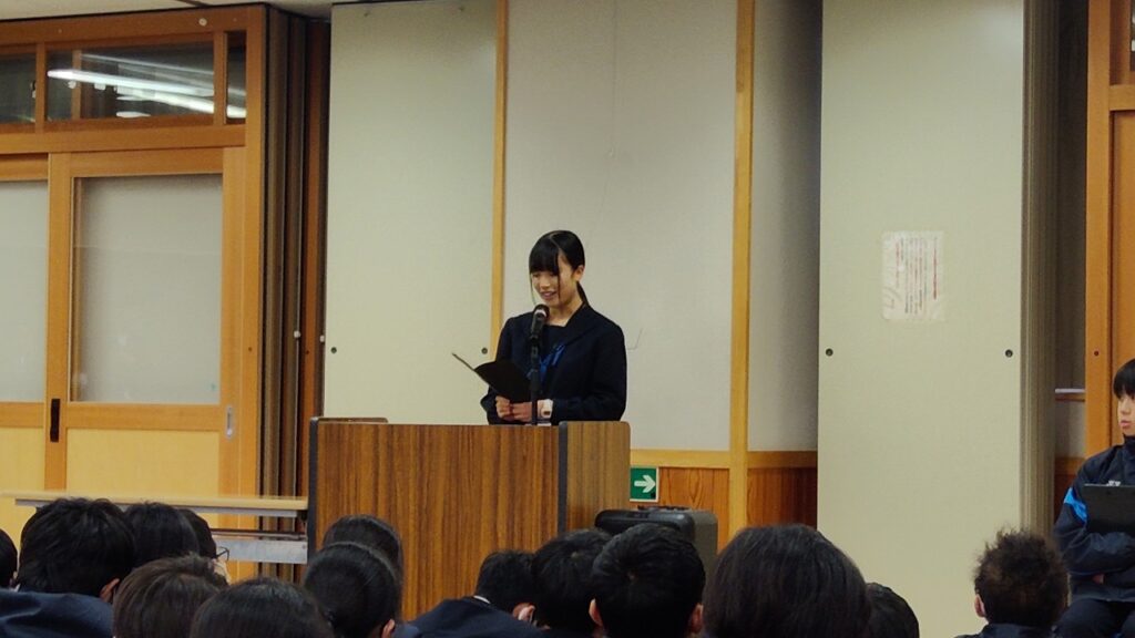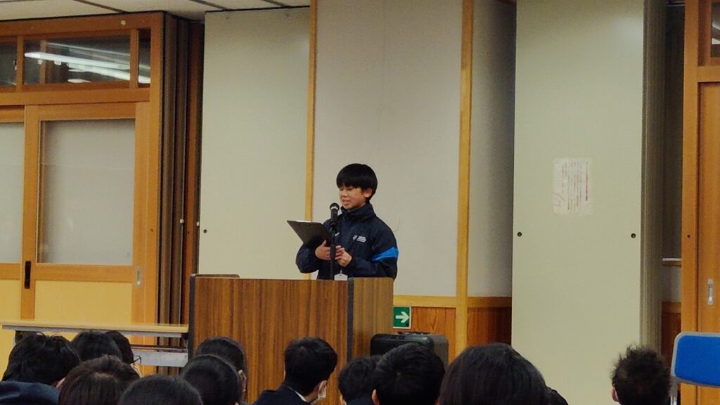 続いて、生徒代表意見発表がありました。各学年の代表生徒が後期前半を振り返り、それぞれの考えや学びを発表しました。1年生代表の生徒は「意欲的に学習することの大切さ」について、2年生代表生徒は「知識の継承と失敗を恐れず挑戦すること」について、3年生代表生徒は「継続することの大切さと周りの支え」についての内容でした。