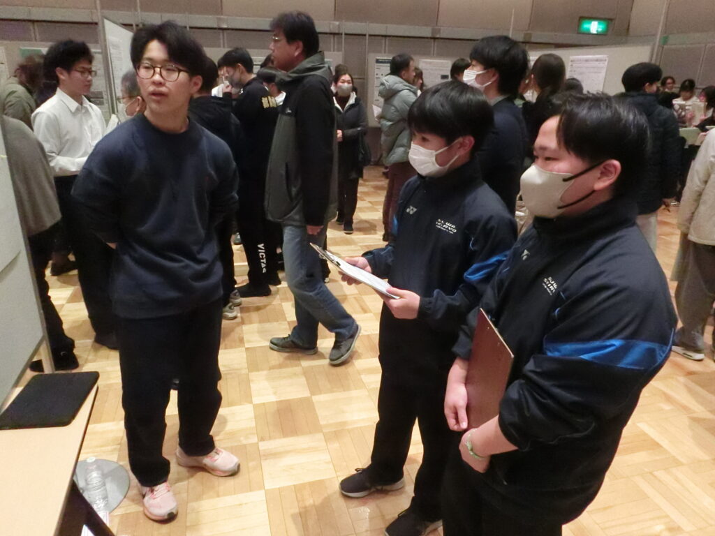 続いて行われた高校2年生による「課題探究」の全体発表およびポスターセッションでは、中学生がそれぞれの興味関心に沿って熱心に耳を傾けていました。さらに、科学部系部活による発表では、高度で専門的な内容も含まれていましたが、中学生たちは内容を正しく理解しようと懸命に聴講していました。質疑応答の時間には、中学生から高校生へ積極的に質問を投げかける姿も見られ、探究に対する高い意欲が感じられる時間となりました。