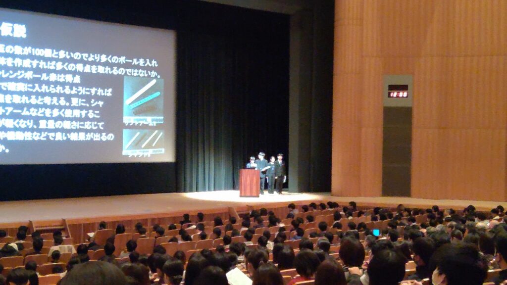 中学校からは、3年生の代表生徒3名と科学部が登壇しました。3年生は「アリの協力行動の非効率さの原因とは」「円に内接する四角形を使ったゲーム『共円』で勝利するためには」「言語及び触覚イメージの対応関係に関する研究」といった、多岐にわたる専門的なテーマについて発表を行いました。また、科学部は「運搬性や安定性の高い機体をつくるためには」というテーマで、実験と考察の成果を報告しました。発表の様子からは、研究プロセスや自らの考察が聞き手に伝わるよう、発表内容やスライドを十分に練り上げ、準備されてきたことが感じられました。また、終始堂々とした態度でプレゼンテーションを行っていたのが印象的でした。質疑応答の場面では、高校生から今後の研究の深まりにつながるような鋭い質問や意見が寄せられ、中高を超えた有意義な対話が見られました。