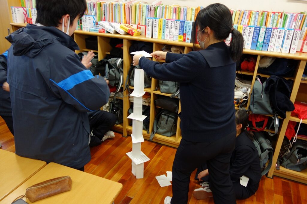 本日の絆タイムは、各学年で行いました。1年生はペーパータワー、2年生はドミノ、3年生はヘリウムリングに取り組みました。
