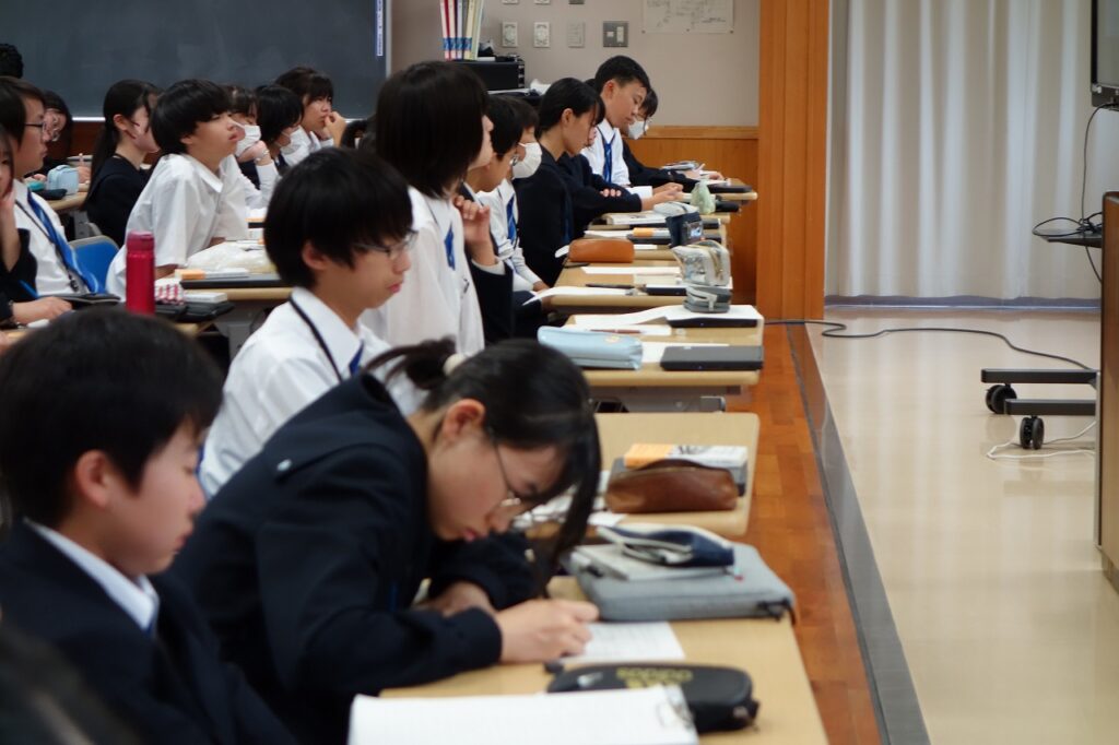 講演では、まず、諏訪の「風土」として、諏訪郡内の産業や地形の特徴についてお話がありました。後半は、実際に三澤勝衛先生が授業で使っていた資料を用いて、「100年前の三澤勝衛先生の授業を再現」してくださいました。米の作付面積の資料から、日本地図に色を着けてみると、数字や文字だけでは捉えにくい日本の風土と米作りの関係が見えてきました。生徒たちは真剣な眼差しで資料を見つめ、思考し、熱心にメモを取っていました。志村先生からは、「清陵の探究を大切にした授業の源流は三澤勝衛先生にある」とお話しいただきました。そして何より、志村先生の探究心と情熱に触れ、生徒たちも学びへの意欲を高める貴重な機会となりました。