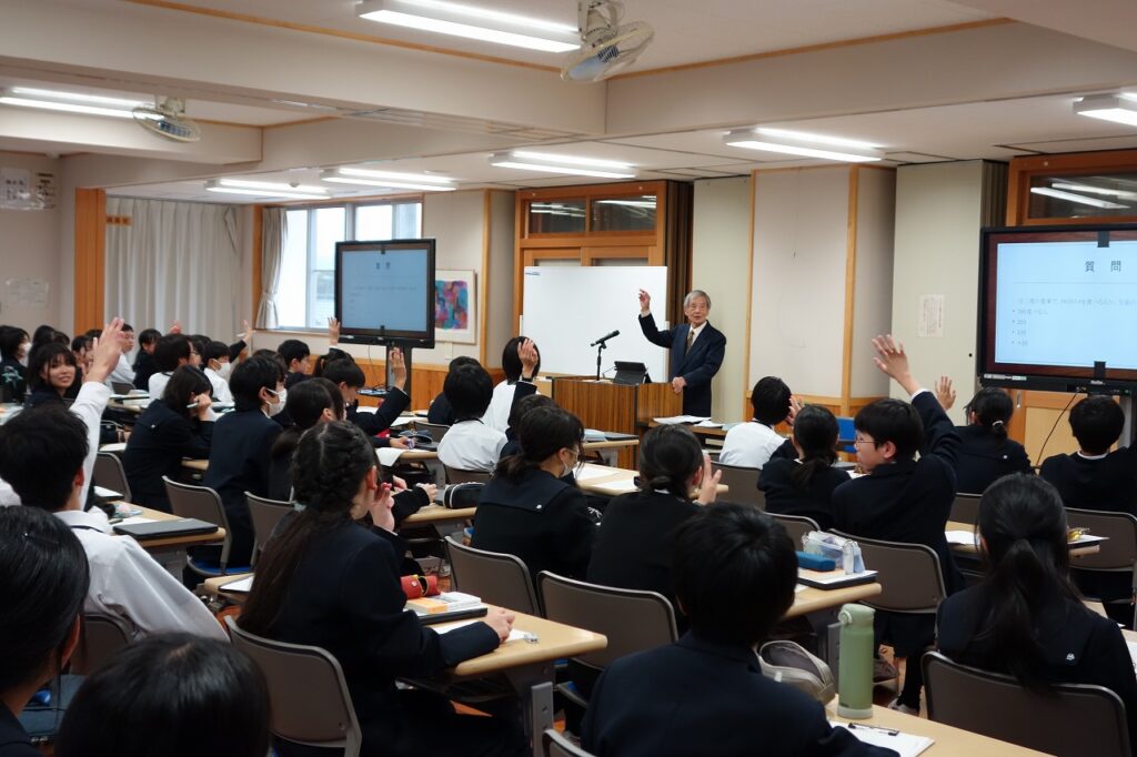 本日、1年生を対象に、総合的な学習の時間として「風土産業を読む」講演会が行われました。講師には、諏訪市出身で元都立高校校長の志村明善先生をお迎えしました。志村先生は、長年にわたり三澤勝衛先生の研究に取り組まれており、著書『三澤勝衛「風土産業」を読む』を本校生徒に毎年寄贈くださっています。生徒たちは事前学習としてこの書籍を読み、講演会に臨みました。