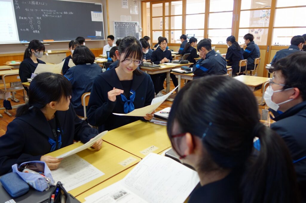 授業では、ニュース番組の解説コーナーをイメージし、グループ内でキャスター役、解説者役、視聴者役に分かれて進行しました。キャスター役は解説を引き出す質問を工夫し、解説者役は聞き手に伝わる話し方を意識するなど、どのグループも本物のニュース番組さながらのやり取りが見られました。視聴者役の生徒は「専門性」「質問力」と「わかりやすさ」の観点から発表を評価し、互いに学び合う姿が見られました。活動後には、「物価高はどのような要因で起こり、どのような対策が考えられるか」について、自分の言葉でまとめました。