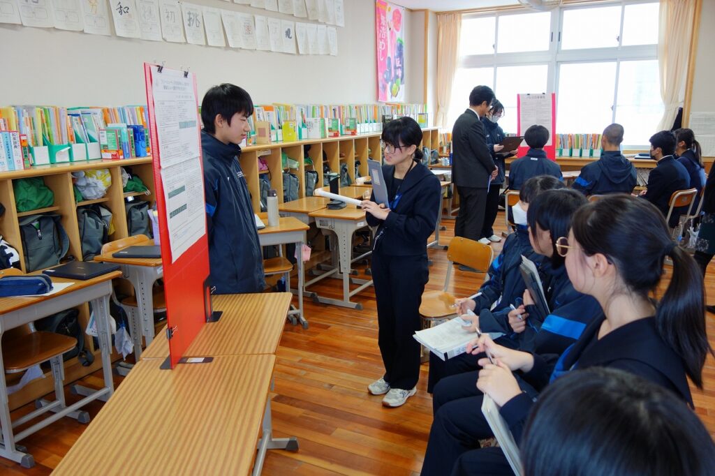 発表会は小グループに分かれて行われ、生徒たちは自作のジャーナルやポスターを使いながら、研究の動機や検証結果、そこから得られた考察を自分の言葉で力強く語りました。発表後の質疑応答では、鋭い質問や温かい感想が飛び交い、互いの視点の違いを楽しみながら学びを深める姿が印象的でした。特に3年生からは、後輩たちへ探究の進め方や分析方法について具体的なアドバイスが送られる場面もあり、個々の研究成果を超えて、学校全体で「探究」という学びのプロセスそのものを共有する貴重な時間となりました。